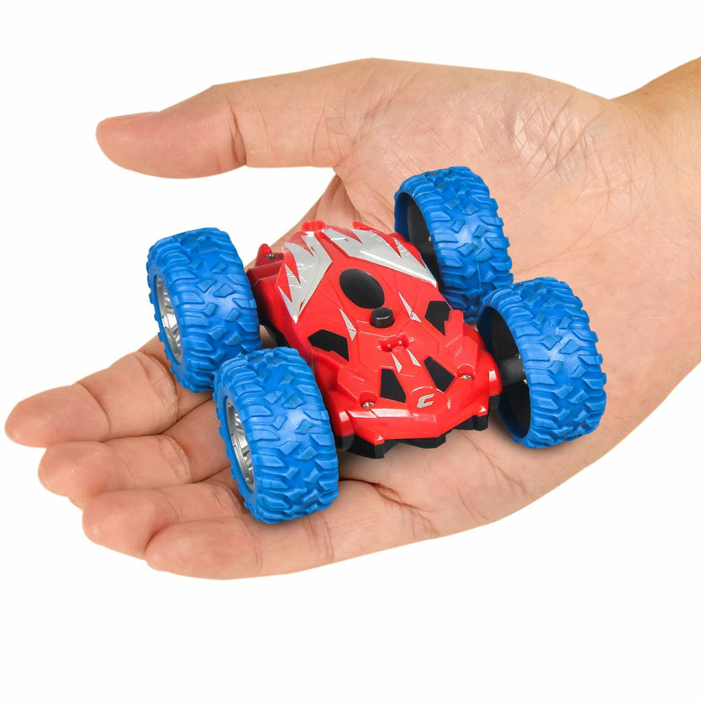 - MINI RC STUNT CAR FOR KIDS: The Cyclone Mini RC car features 2-sided off-road driving, bright LEDs, and tough all-terrain rubber tires; includes an easy remote control transmitter for 1 button spins and stunts