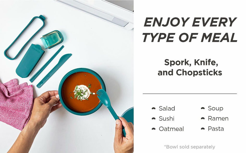 • For Every Meal: Enjoy every meal on-the-go with Beantos reusable food-grade cutlery set. Cut into meats easily with the knife, eat ramen noodles or sushi with the chopsticks, or use the spork with soup, salad, pasta, cereal, enchiladas, rice, beans, & more.